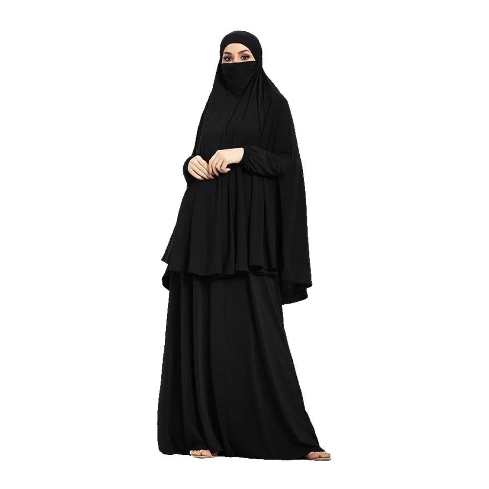 This Jersey Niqab Burka or Khimaar is ideal for prayers or day wear⋅ It is a Pull-on Hijab which drapes from the head and is made from a high-quality jersey fabric⋅ The Niqab portion is optional, it can tucked under chin or put over the nose⋅ Elasticated armholes for you to be comfortable to in.