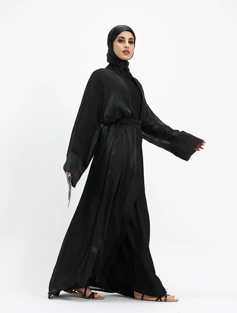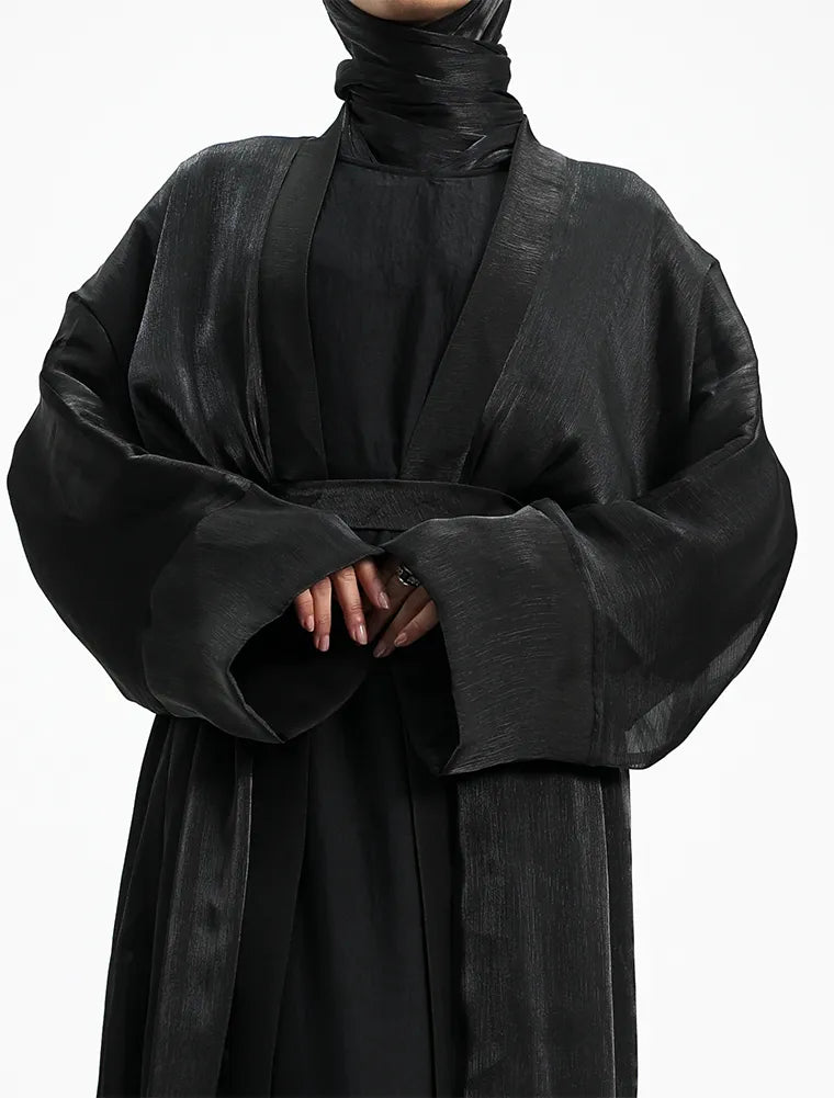 This elegant 2-piece set embodies effortless minimalism while offering all-day comfort. It features a full-sleeve slip dress, beautifully layered beneath a lightweight organza kimono for a refined finish. Designed with practicality in mind, the slip includes functional side pockets on both sides for everyday essentials. A separate matching belt is included, allowing you to style the set cinched for a structured silhouette or worn loose for a relaxed, casual look—perfect for versatile, everyday wear.