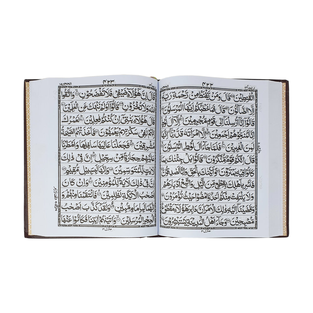 Large Quran in the South African font bound in a Hardback. It comes in 11 lines and has large letters.