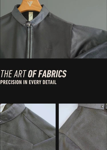 Made from a premium textured fabric in a deep black tone, this thobe delivers a smooth, structured drape while remaining lightweight and breathable. The snug stand collar is finished with subtle texture detailing and polished metal accents, offering a sharp, tailored look.
