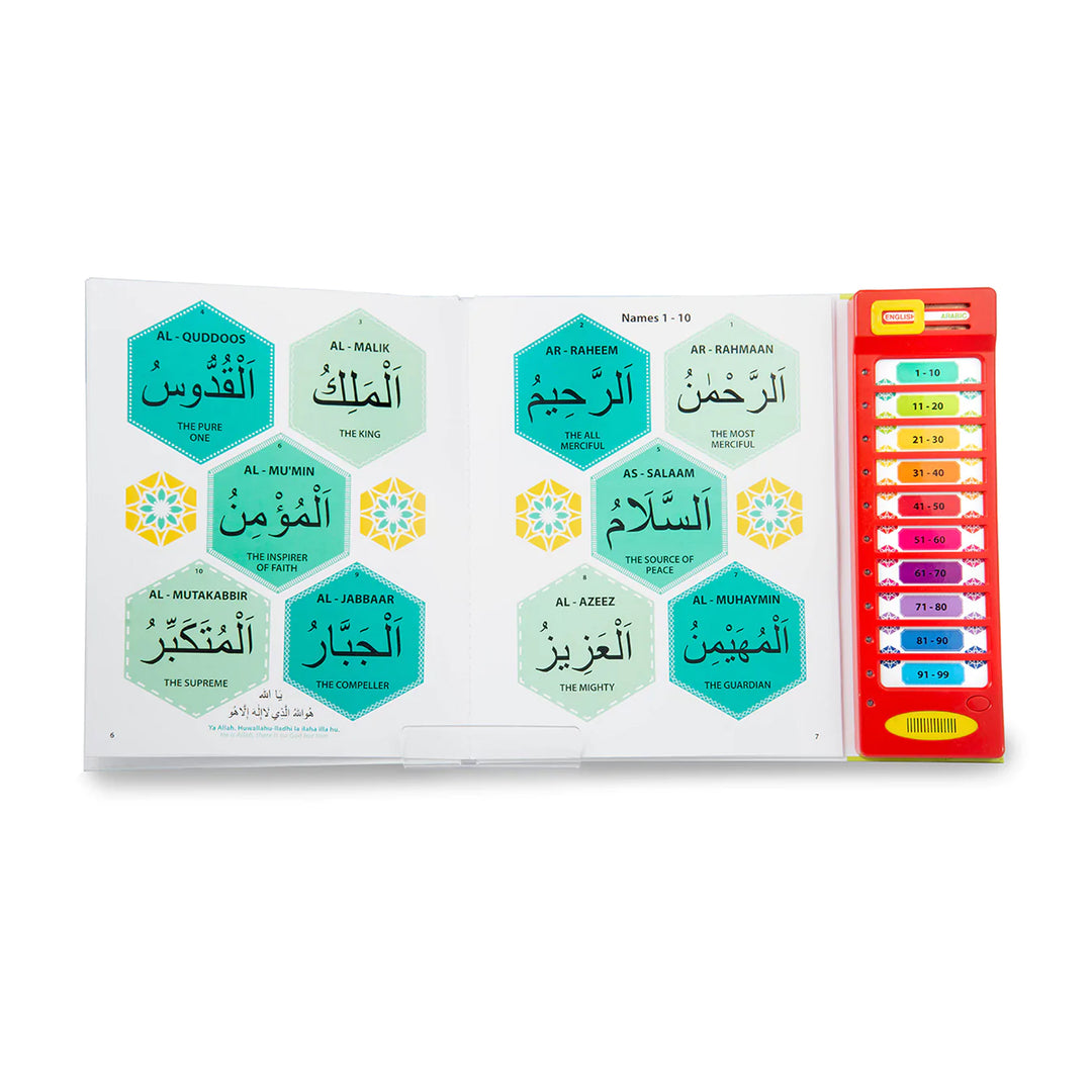 The names are divided into easy sets of 10 and recited in a tuneful way to help memorisation. Use the light up sound panel to hear each set, listening and learning and one button at the end that sings all 99 names melodically in one go. Also toggle the sound panel switch to listen to all 99 names in English too.