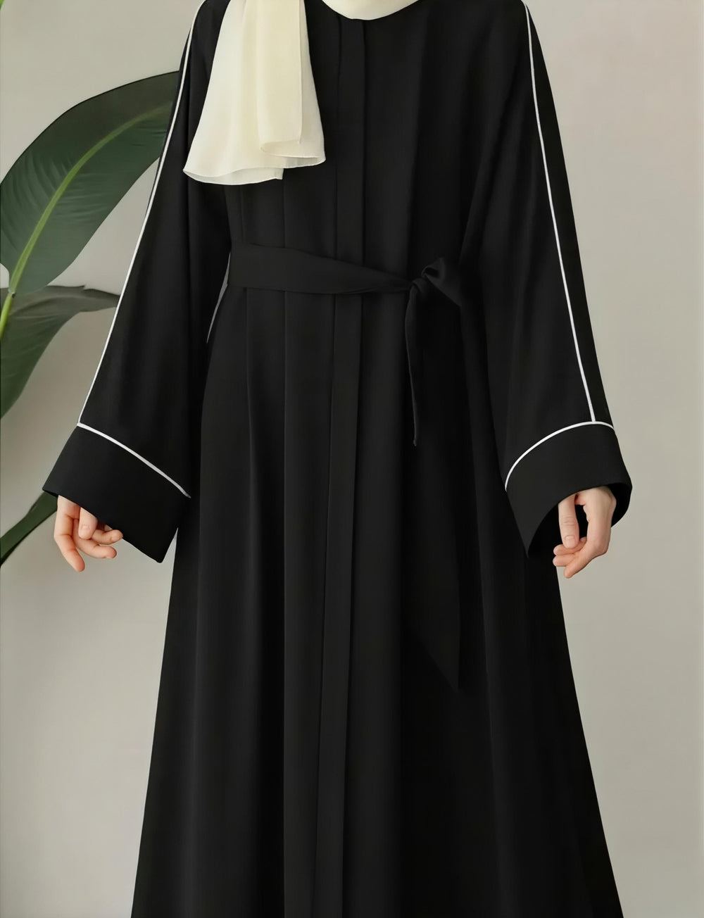 Qamar Ribbed Abaya in classic black. Crafted from fine comfortable fabric, this one-size garment offers a graceful drape and timeless elegance with modesty. Its versatile design complements a variety of styles while ensuring comfort throughout the day. Perfect for any occasion, the Qamar Abaya combines understated sophistication with effortless wearability.