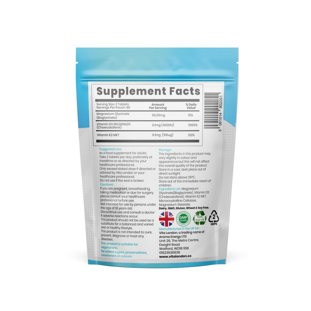 Support your everyday wellbeing with Vita London’s Vitamin D3, K2 & Magnesium Glycinate tablets. Each serving provides 4000IU of Vitamin D3, combined with Vitamin K2 (100µg) and Magnesium Glycinate (56mg), formulated to work together to support normal body functions. This vegetarian-friendly supplement is made in the UK using high-quality ingredients.